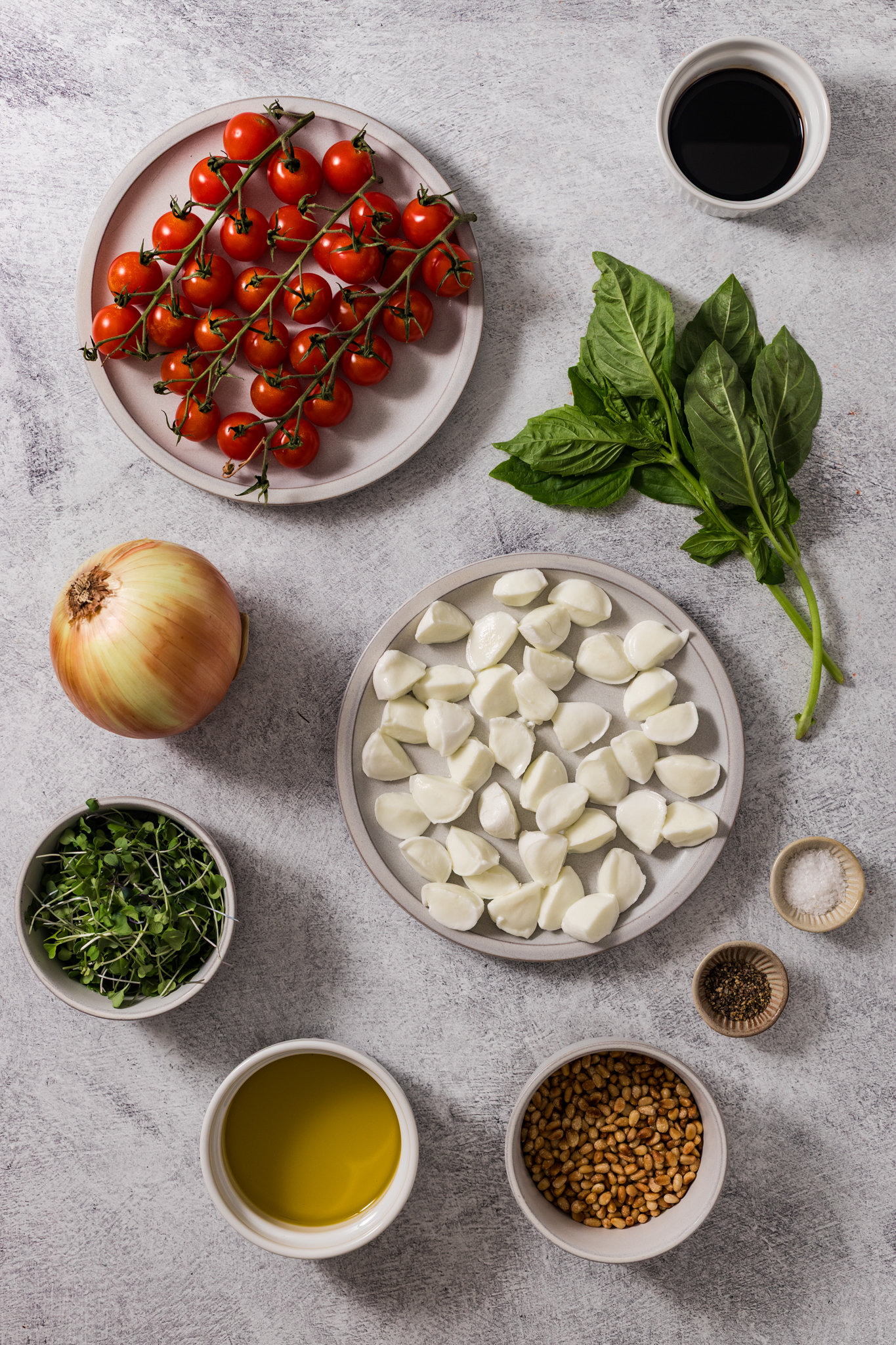 Halve the cherry tomatoes and arrange on a platter. Add mozzarella, microgreens, onions, and pine nuts. Drizzle with basil oil and balsamic reduction. Sprinkle with flaky salt, cracked pepper, and garnish with basil.
