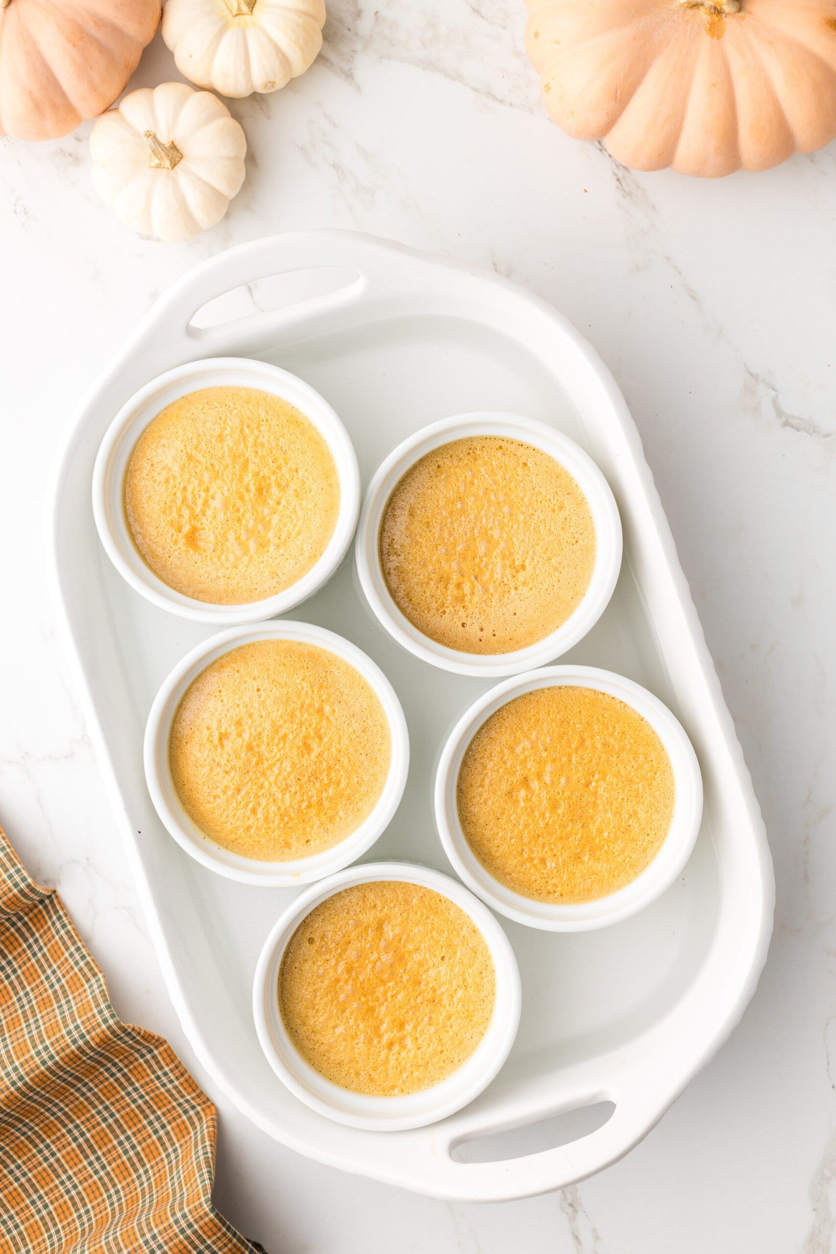 Divide the mixture into 5 (5-inch) ramekins, about an inch from the top. Place the ramekins into a baking dish and fill the baking dish with boiling water to reach about halfway up the sides of the ramekins.