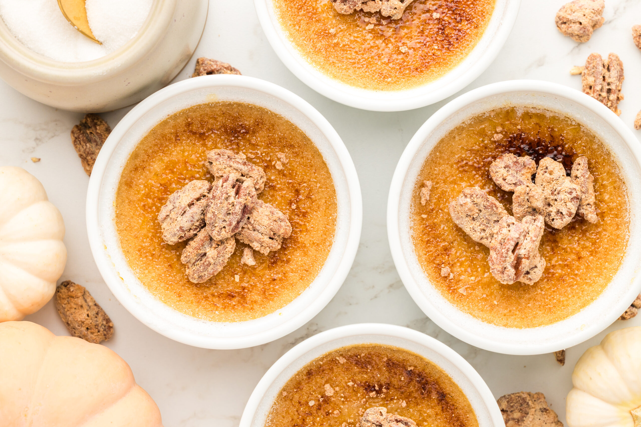 While crème brûlée is cooling, set your oven to 250 degrees. Mix sugars, salt, and pumpkin spice seasoning in a small bowl. Whisk egg whites and vanilla in a separate mixing bowl until frothy. Toss in pecans until covered and slowly pour over the sugar mix until evenly coated. Spread on a baking sheet.